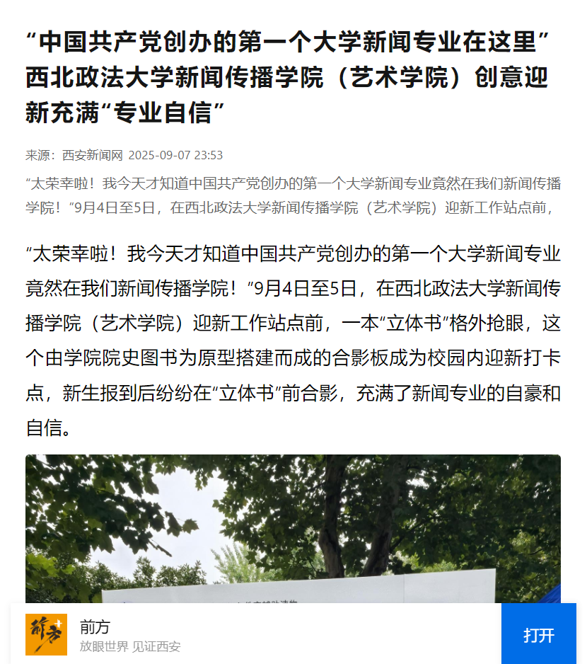 【华商网】西北政法大学新闻传播学院迎新:为新生开启特别入学之旅:https://news.hsw.cn/system/2025/0907/1871103.shtml