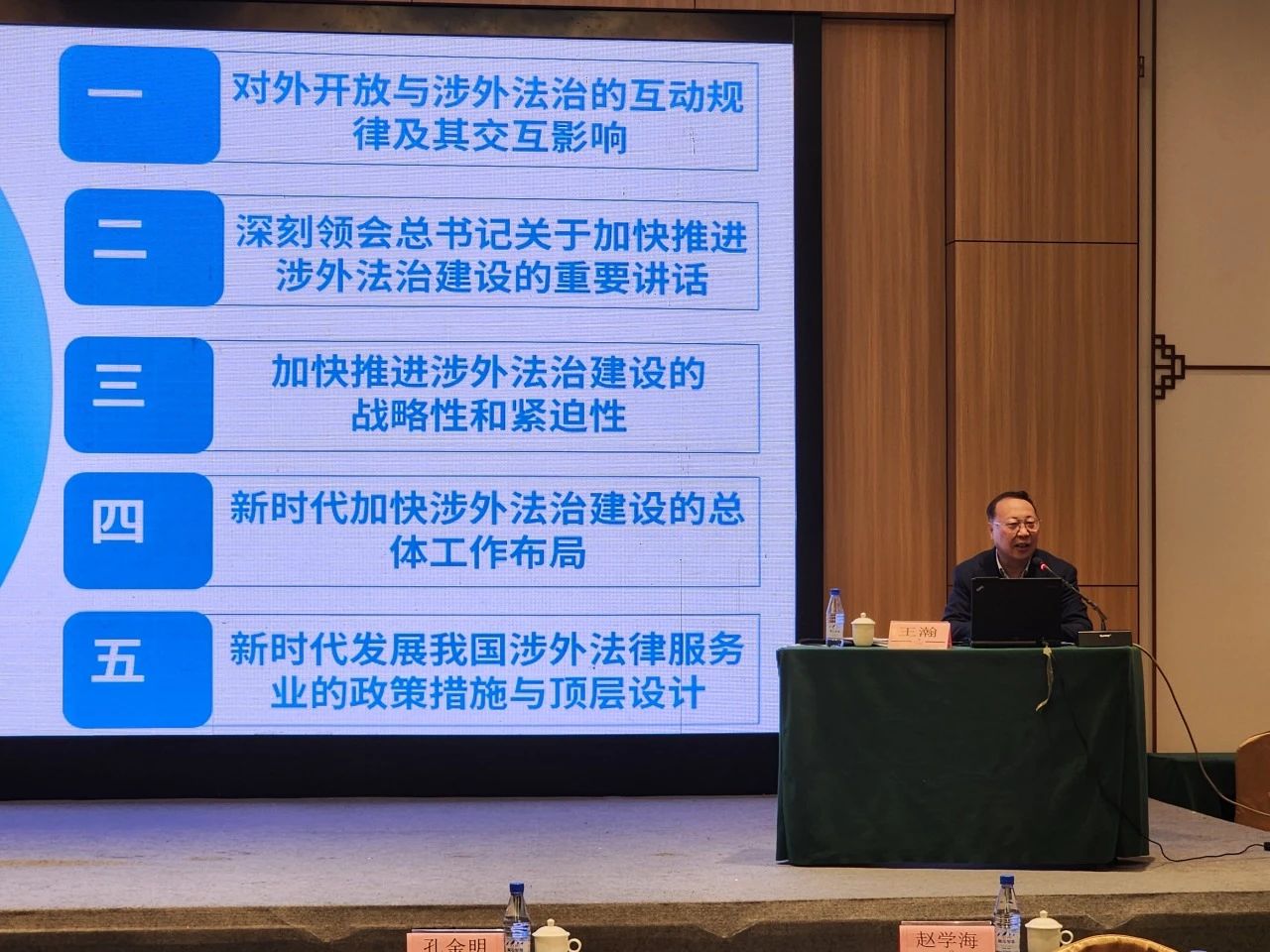 武汉大学肖永平教授、西北政法大学王瀚教授等知名专家应邀授课。王瀚教授以"推进高水平对外开放与加快涉外法治建设"为题,系统阐释了习近平总书记涉外法治思想的核心要义,分析了对外开放与涉外法治的互动关系,并提出了发展高质量涉外法律服务的政策建议。