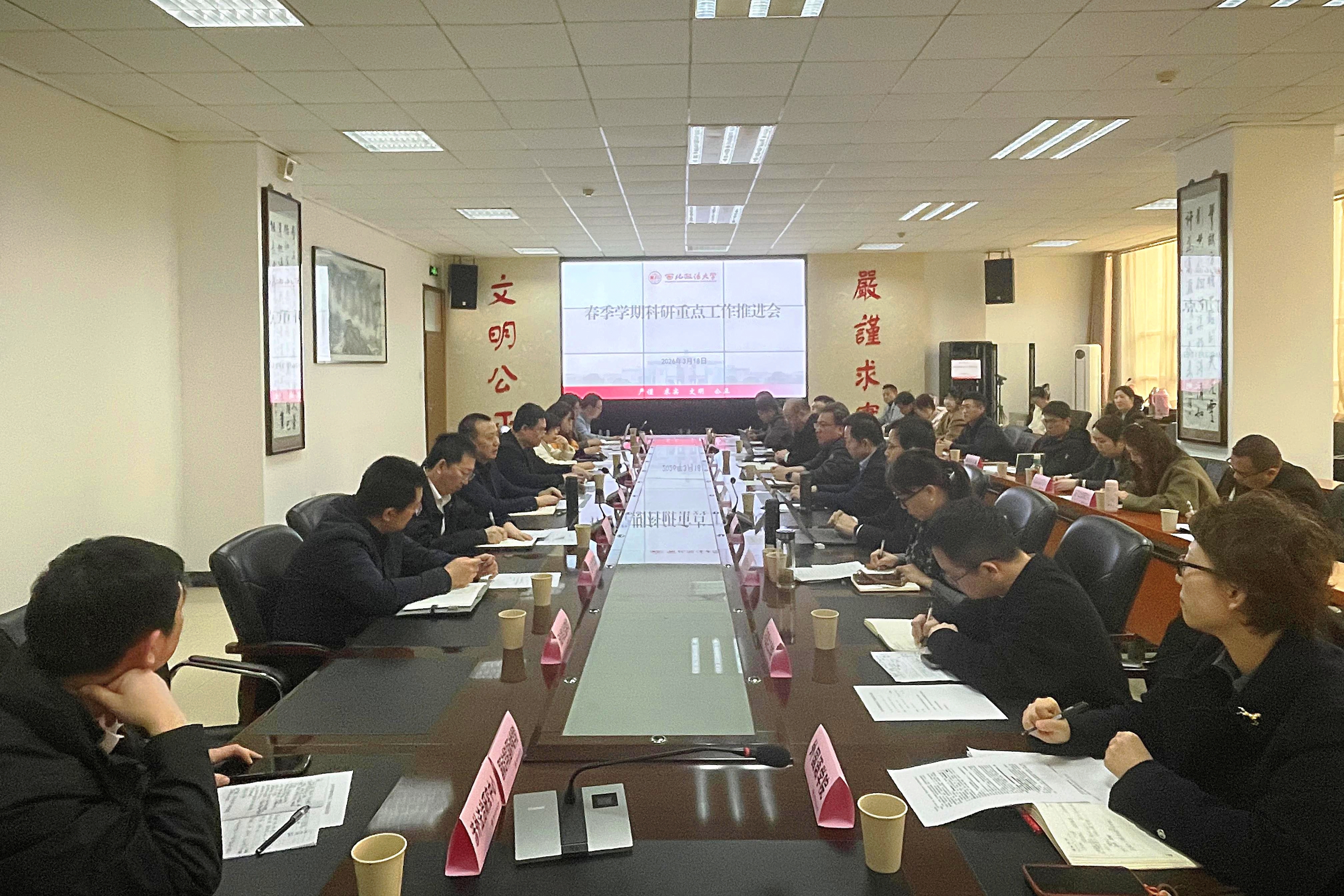 3月18日下午,我校召开春季学期科研重点工作推进会,副校长马朝琦出席会议并讲话,各教学、科研单位负责人及科研处全体干部参加会议。会议由科研处处长倪楠主持。 会议指出,学校科研工作虽取得阶段性成效,但对照“双一流”建设目标仍存在差距。各单位要进一步锚定目标、夯实责任、真抓实干,持续深化有组织科研,全力推动年度科研工作再上新台阶、实现高质量发展。 会议要求,一是实现顶层设计,树立科研标杆,凝聚发展共识,营造浓厚学术氛围;二是推进制度完善,夯实科研基础,聚焦成果培育、团队建设与青年人才支撑;三是立足重大需求,创新科研模式,落实“一院一策”,激发创新创造活力;四是强化学术交往,打造科研品牌,对标一流标杆,提升学术影响力。 会议强调,科研是支撑学校高质量发展的核心动力。各教学、科研单位要以正确政绩观为引领,锚定“双一流”标准,在“十五五”规划开局之年,系统谋划、精准发力,为学校“学术立校、科研兴校”筑牢坚实基础。 会上,科研处系统部署本学期科研重点任务。各教学、科研单位围绕国家社科基金项目、教育部项目申报准备情况依次发言,全面梳理工作进展、分析存在问题,并明确下一步推进计划。 (撰稿:科研处 撰稿:吕叔阳 审核:倪楠)