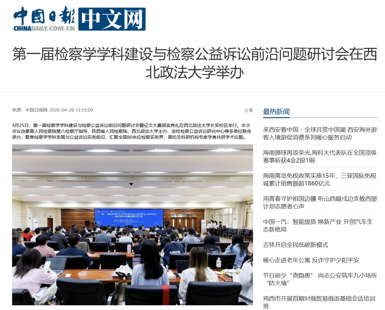 4月25日,第一届检察学学科建设与检察公益诉讼前沿问题研讨会暨征文大赛颁奖典礼在西北政法大学长安校区举行。本次会议由最高人民检察院第八检察厅指导,陕西省人民检察院、西北政法大学主办,该校检察公益诉讼研究中心等多单位联合承办,聚焦检察学学科发展与公益诉讼实务前沿,汇聚全国80余位检察实务界、高校及科研机构专家学者共研学术议题。 开幕式由西北政法大学副校长、检察公益诉讼研究中心主任常安主持。该校党委副书记、校长范九利在致辞中表示,本次研讨会是推动新时代检察理论创新的重要实践,学校将以此次会议为契机,深化检校协同育人、协同研究,助力中国检察学自主知识体系构建。 最高人民检察院第八检察厅厅长徐向春对会议召开表示祝贺,他指出,检察公益诉讼相关研究要坚持实践导向与问题导向,强化检校合作与成果转化,为检察公益诉讼高质量发展筑牢理论根基。陕西省人民检察院副检察长高洁介绍了陕西公益诉讼检察工作实践成果,提出将持续深化检校合作,推动实务经验向理论成果转化,形成可复制推广的制度经验。 开幕式后,征文大赛颁奖典礼同步举行,与会嘉宾为获奖论文作者颁奖,常安副校长宣读获奖名单,充分肯定本次征文大赛的学术价值与人才培育意义。 主题研讨环节,多位实务专家与学者围绕检察学自主概念体系建构、学科知识谱系、网络公益诉讼、基层公益诉讼监督、区域环境公益诉讼等议题展开深入交流。来自多地检察机关及高校的参会人员,结合办案实践与学术研究,分享前沿观点、剖析实务难题。评议嘉宾从学术规范、理论深度、实务对接等角度,为相关研究提出优化建议,助力检察学研究提质增效。 研究生论坛为青年学子搭建学术交流平台,来自国内多所知名高校的博硕士研究生,围绕生态环境、个人信息保护、行政公益诉讼等领域的热点问题分享研究成果。点评专家充分肯定青年学子的学术潜力,鼓励其立足实务、夯实理论,提升学术研究的严谨性与针对性,培育检察公益诉讼领域青年学术人才。 闭幕式由西北政法大学法治学院法律硕士教育学院党委书记张学龙主持。最高人民检察院第四检察厅挂职副厅长、西北政法大学期刊社社长、检察公益诉讼研究中心执行主任付玉明教授作总结发言,他表示,本次会议研讨深入、成果丰硕,达成多项学术共识,未来将持续深化检校合作,拓展数字检察、涉外检察等新兴领域研究,推动理论与实务深度融合,提升成果转化效能。 此次研讨会搭建起理论界与实务界交流互鉴的优质平台,有效推进了检察学学科建设与检察公益诉讼制度完善,对深化检校协同、服务新时代检察工作高质量发展具有重要意义。西北政法大学检察公益诉讼研究中心将持续发挥专业研究优势,打造集科研、教学、实践于一体的高水平法学研究基地,助力国家公益诉讼法治建设。 【中国日报网】第一届检察学学科建设与检察公益诉讼前沿问题研讨会在西北政法大学举办