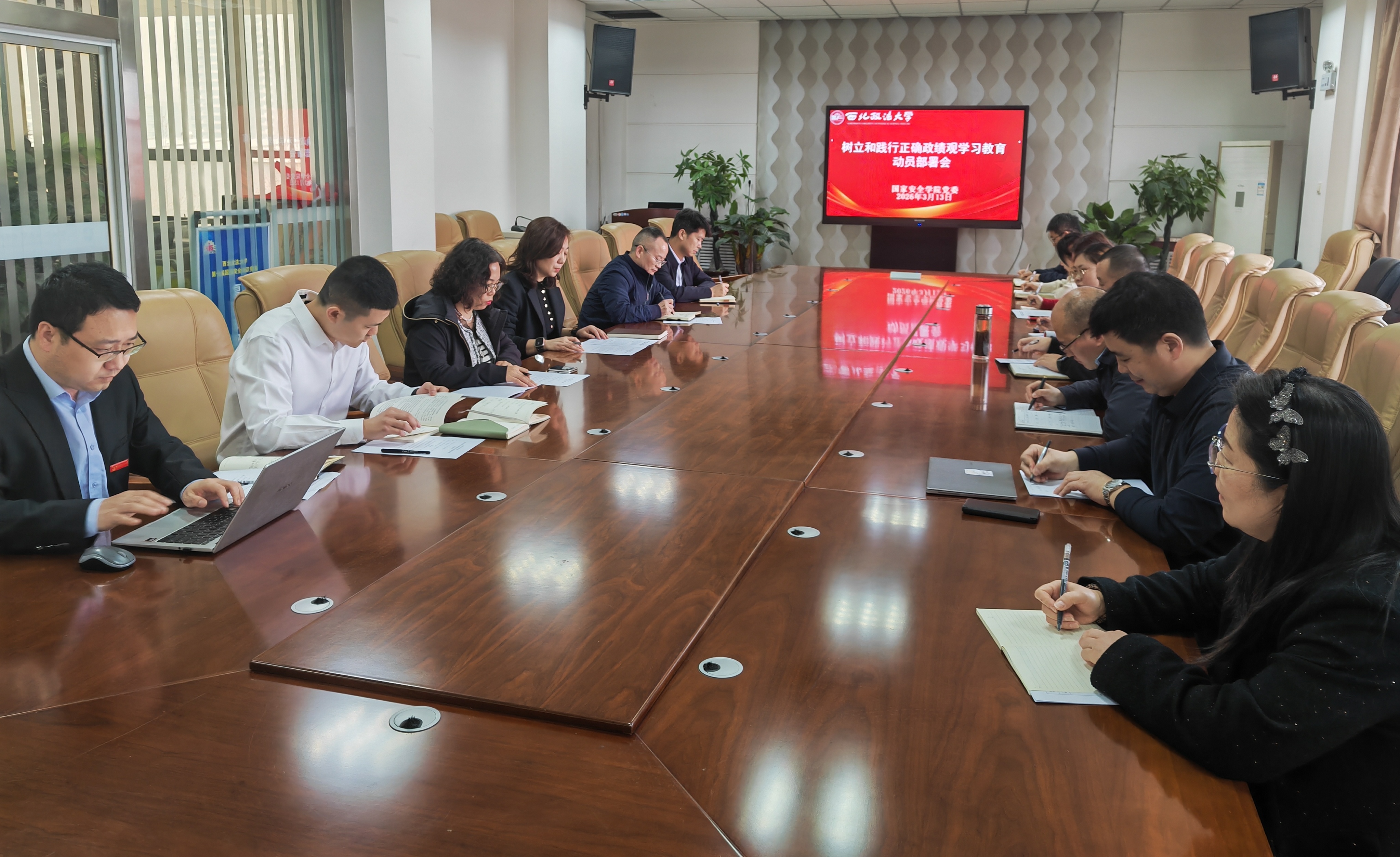 3月13日,国家安全学院党委召开树立和践行正确政绩观学习教育动员部署会。学院领导班子成员、党支部书记、科级干部参加会议,学院党委书记王聪主持会议。 会议学习了《习近平关于树立和践行正确政绩观论述摘编》部分内容,学习了中央党的建设工作领导小组会议、省委常委会会议暨省委党的建设工作领导小组会议精神,传达学习校党委会启动部署树立和践行正确政绩观学习教育工作会议精神。 会议要求,要聚焦“立党为公、为民造福、科学决策、真抓实干”总要求,把学习教育与学院中心工作深度融合,紧密结合学科建设、教学科研、人才培养、学生管理、社会服务等具体工作,聚焦工作中的短板弱项和师生急难愁盼问题,在深学、真查、实改上见成效,推动学习教育入脑入心,确保学习教育成果可感可及。 会议强调,全院上下要以此次学习教育为契机,切实把思想和行动统一到党中央的决策部署和省委、校党委工作部署上来,以高度的政治责任感和使命感,认真抓好学习教育各项任务落实。各党支部和全院党员干部要迅速行动起来,以更加饱满的热情、更加务实的作风、更加有力的举措,推动学习教育高标准开展、高质量推进,为学院“十五五”良好开局提供坚强政治保障。 (供稿:国家安全学院(反恐怖主义法学院) 撰稿:王卓 审核:王聪)