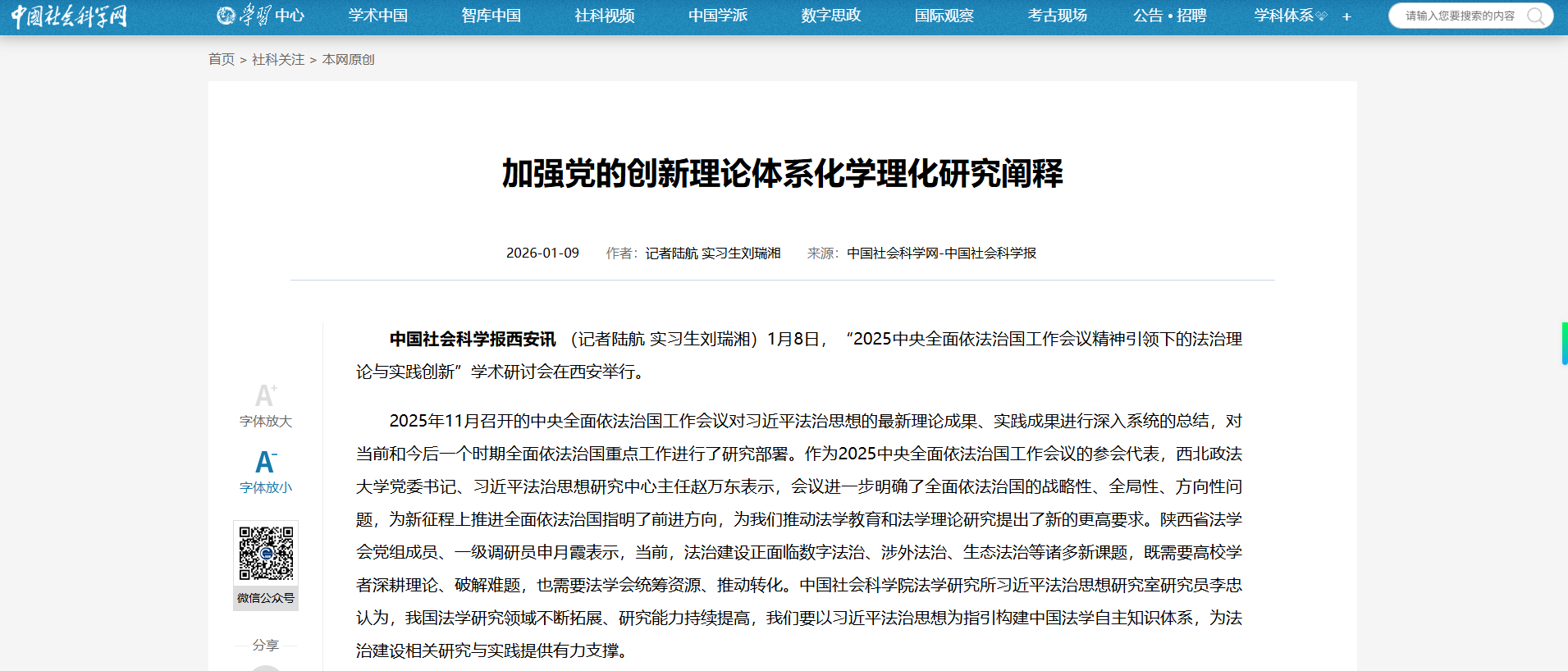 中国社会科学报西安讯(记者陆航 实习生刘瑞湘)1月8日,“2025中央全面依法治国工作会议精神引领下的法治理论与实践创新”学术研讨会在西安举行。