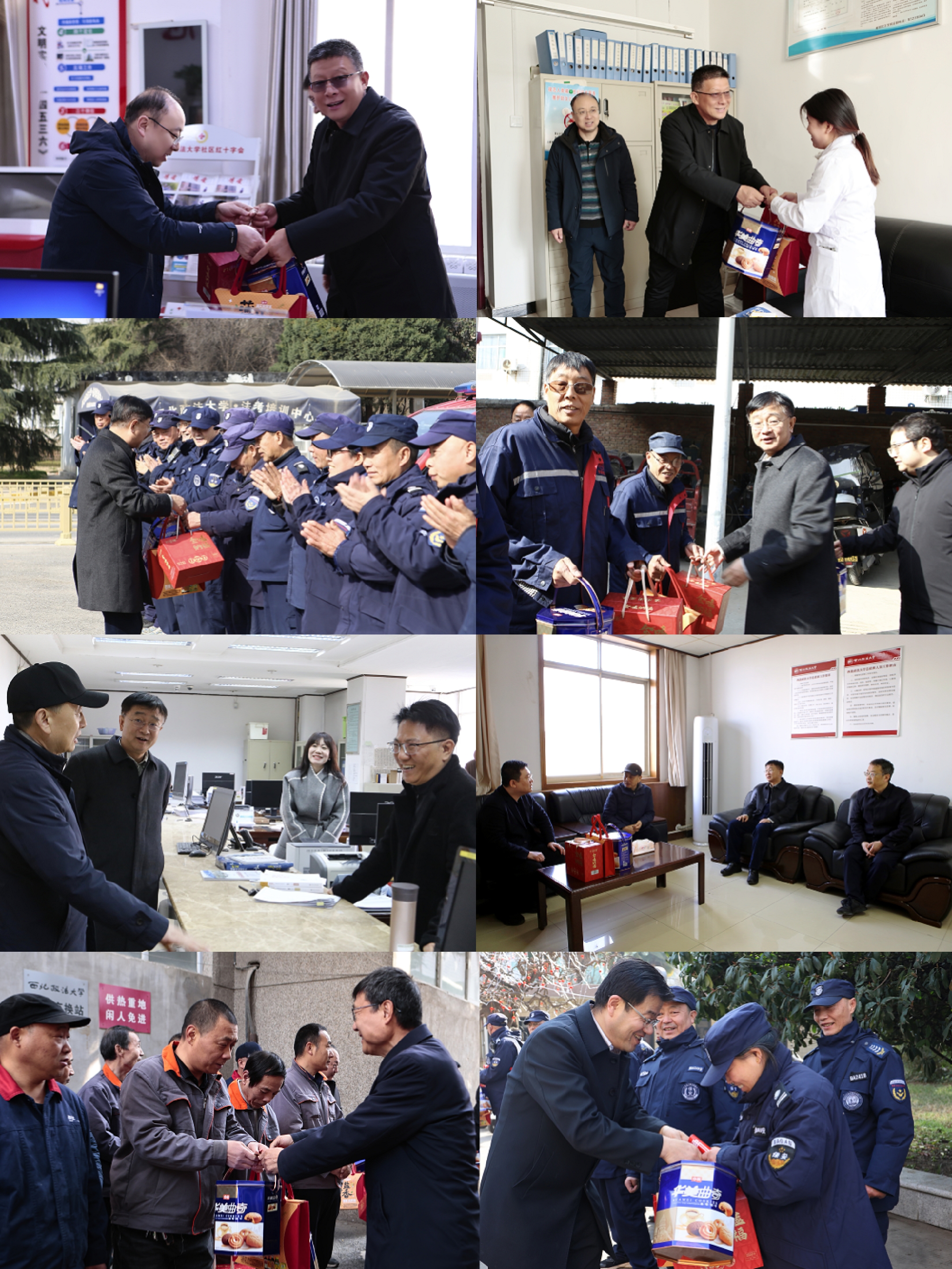 校领导分别来到雁塔校区和长安校区保卫处、后勤保障处、社区、总值班室、财务处、门诊部、收发室等地,看望慰问假期坚守岗位的工作人员,提前送上新春祝福,对大家恪尽职守、用心用情服务师生的辛勤付出表示诚挚感谢,希望大家一如既往做好各项服务保障工作,营造安全有序、温馨暖心的校园环境,努力让学校师生员工度过一个平安、祥和的春节假期。