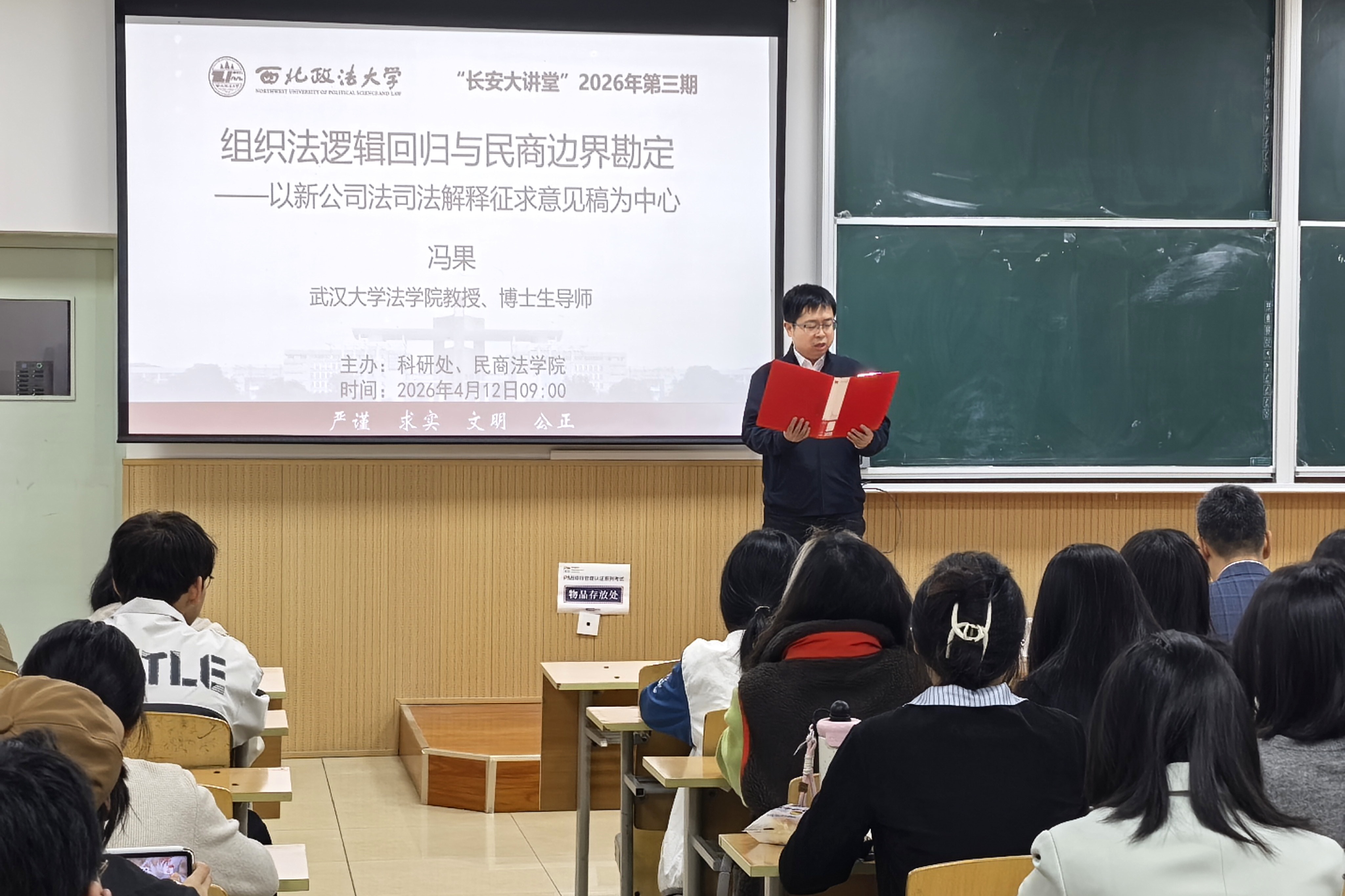 4月12日上午,由科研处、民商法学院联合主办的“长安大讲堂”2026年第三期在我校长安校区成功举办。武汉大学法学院冯果教授应邀作题为《组织法逻辑回归与民商法边界勘定——以新公司法司法解释征求意见稿为中心》的学术报告,我校副校长常安出席并致辞。讲座由科研处处长倪楠主持,200余名师生到场聆听。