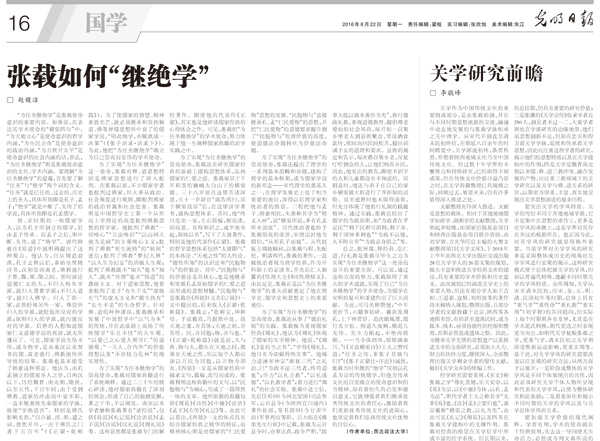 编者按:《光明日报》2016年8月22日第16版发表了我校赵馥洁教授《张载如何“继绝学”》一文,文章从批异端、释经典、弘仁道、行礼教等四个方面阐述了张载尽毕生之力为实现“为往圣继绝学”这一使命而奋斗的的努力,并指出张载为传承文化而自觉确立的使命意识和担当精神,有着恒久的启发和感召意义,它既增强着我们继承优秀传统文化的责任心,激励着我们更新优秀传统文化的进取心,也坚定着我们弘扬传统文化优势的自信心。全文转载如下:
