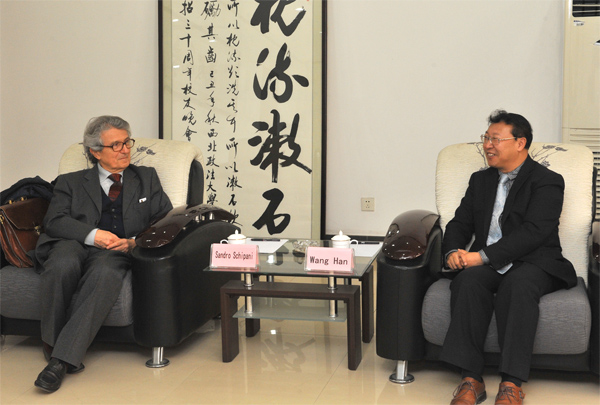 斯奇巴尼教授对此次应邀重访我校以及学校的热情欢迎表示感谢,期待能与我校建立深厚的友谊及学术间的实质性合作。同时,对我校日新月异的发展态势及近年来取得的丰硕成果表示祝贺。教授指出,我校融合了古城的历史积韵与科学化开放性的国际化交流视野,即将开展的博士生教育也对提升教学科研大有裨益。斯奇巴尼教授希望与我校进行罗马法领域实质性交流,尽力将我校推介给世界不同大学,促进校际间有益的交流活动,并鼓励我校学生教师赴罗马研习、学习对现代不同文化的国家法律影响颇深的罗马法;教授同时指出,中国正在实践着罗马法所倡导的“正义、公平、诚信”,世界对中国的发展前进拭目以待。