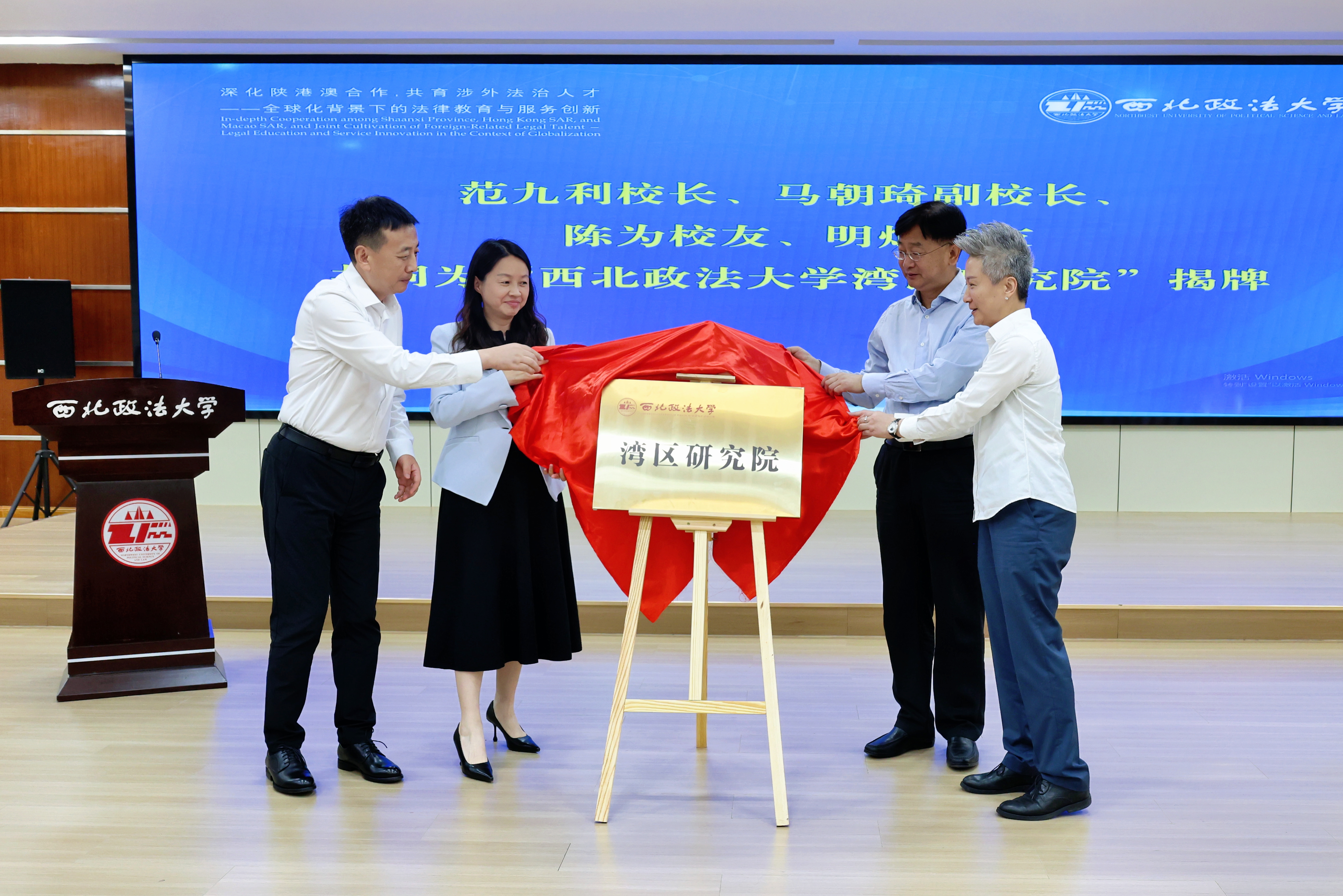 开幕式上,范九利、马朝琦携手校友陈为、明灿,共同为“西北政法大学湾区研究院揭牌”。