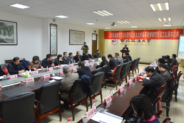 12月18日,“大学发展新常态论坛暨西北政法大学高等教育研究所成立31周年庆典”在我校长安校区隆重举行。校党委书记宋觉研究员,副校长宣力研究员、郭捷教授、王瀚教授,校长助理汪世荣教授等出席会议。西安交通大学、西北工业大学、西安电子科技大学、陕西师范大学、西北大学、西安建筑科技大学、西安理工大学、陕西科技大学、西安石油大学、西安邮电大学、西安外国语大学、西安财经学院等12所高校的专家学者,校内有关单位的领导以及高等教育研究所的研究人员和研究生代表等,共60余人参加了本次论坛庆典。会议围绕大学发展新常态的主题进行了充分的交流研讨。本次会议由我校主办,高教研究所承办。