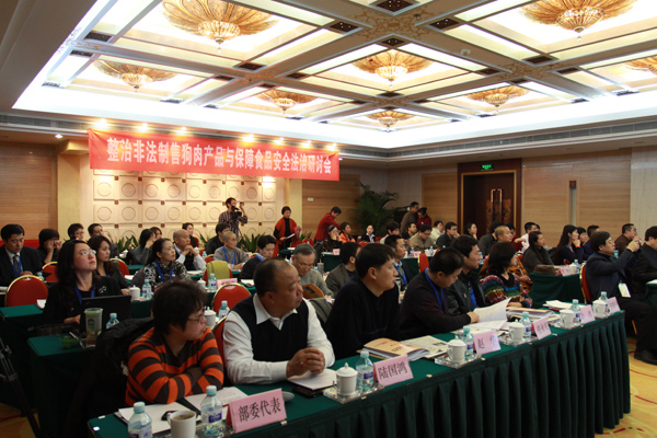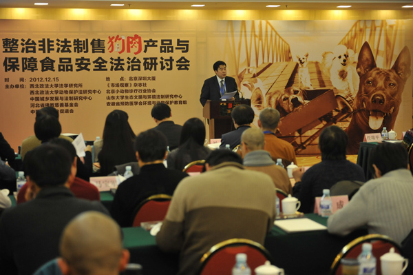 12月15日,由我校法学研究所、动物保护法研究中心等单位联合主办的“整治非法制售狗肉产品与保障食品安全”法治研讨会在北京深圳大厦举行。来自西北政法大学、山东大学、河北经贸大学、中央社会主义学院、安徽医科大学、国家行政学院等高等院校以及北京小动物诊疗行业协会、中国兽医协会、河北佛教慈善基金会、动物守护神公益机构、《市场观察》杂志社、中国公益事业促进会、人大、政协和国家部委等60余位专家学者以保障食品安全为目的,围绕非法制售狗肉产品与食品安全的法律、社会伦理道德以及公共卫生安全和社会稳定等问题进行了广泛的沟通与深入的交流,为取缔非法狗肉产业链、从源头上杜绝私宰烂屠狗而带来的食品安全隐患寻求法律依据和社会舆论支持。我校法学研究所孙江教授、李军波老师参加研讨会并做主题发言。