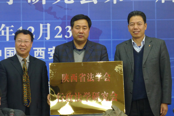 王周户教授就陕西省行政法学研究会的发起、宗旨与工作计划做出汇报。陕西省法学会研究部主任魏清利宣读了陕西省法学会的批复文件。姬亚平教授宣读陕西省法学会行政法学研究会组成人员的建议名单,并获得大会通过,王周户教授当选为会长。著名行政法学家、行政法学院名誉院长应松年教授担任该会名誉会长,陕西省人民高级法院院长安东、陕西省人民政府参事宋龙凌、陕西省政府法制办主任宋昌斌担任该会顾问。魏清利主任、王瀚副校长共同为研究会授牌。