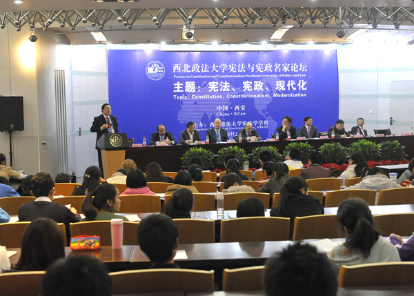 10月21—24日,值2011年全国宪法年会和国际宪法学协会圆桌会议在我校召开之际,西北政法大学“宪法与宪政名家论坛”在我校长安校区行政楼二楼报告厅隆重举行。此次宪法学高端论坛的主题是“宪法、宪政、现代化”,按照我校宪法学学科的安排,高端论坛分三场报告会进行。中国宪法学研究会副会长董和平教授主持论坛。