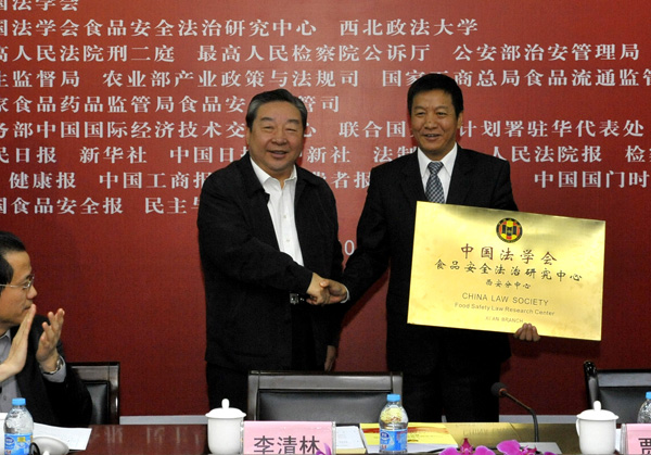 李清林副会长向贾宇校长授予“中国法学会食品安全法治研究中心西安分中心”牌匾。