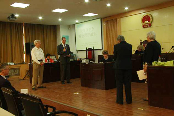 9月19日下午,由美国麻州法官协会和西北政法大学主办,民商法学院和妇女与家事法律研究所承办的中美反家暴交流项目—民事保护令听证程序演示活动在我校南校区BJ14模拟法庭顺利举行。来自美国麻州法官协会的法官及缓刑官、法学教授等七位代表参与演示。本次活动由民商法学院副院长张翔教授主持,亲属法学教研室主任、妇女与家事法律研究所所长张伟教授及其他教师和广大学生参加了旁听。