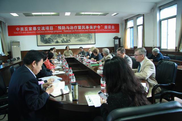 9月20日,由美国麻州法官协会和西北政法大学共同主办,民商法学院和妇女与家事法律研究所共同承办的“中美反家暴交流项目—预防与治疗暨民事保护令”座谈会在我校雁塔校区北行政楼大会议室召开。来自美国麻州法官协会的麻州上诉法院悉妮.汉伦法官、多尔撤斯特市法院罗莎莲.米勒首席法官、麻州大学美国国际开发署司法交流项目共同主持人皮特.安德森荣休法官、麻州著名的家庭暴力法律专家姬斯汀.巴特勒教授、缓刑官劳伦斯等七位代表参加了会议,陕西省法学会研究部主任魏清利先生、省妇联权益部部长宁焕侠女士、西安市中级法院民一庭庭长唐洁法官和民一庭副庭长刘国强法官、省高级法院研究室调研科科长王琪轩法官、西安市莲湖区法院副院长曹媛法官和民一庭王莉莉法官,西安市雁塔区法院西影路法庭副庭长李明法官、陕西博硕律师事务所婚姻法专业律师刘长洪律师、省妇女研究会驻西安市莲湖区法院社工服务站负责人严洁女士等应邀参会,我校民商法学院副院长程淑娟博士、副院长张翔教授、亲属法学教研室主任、妇女与家事法律研究所所长张伟教授、亲属法学教研室副主任、妇女与家事法律研究所副所长赵江红副教授、亲属法学教研室马钰凤博士、民诉法学教研室主任董少谋教授、赵旭东教授、韩红俊博士以及民商法专业的部分研究生也参加了会议。