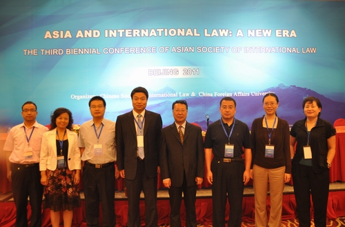 8月27至28日,亚洲国际法学会第三届双年会在北京天伦王朝酒店隆重举行。亚洲国际法学会于2007年在新加坡成立,是亚洲首个区域性国际法学术团体,国际法院中国籍法官薛捍勤为现任会长。本届会议是继2007年新加坡、2009年东京年会后的第三届,也是亚洲国际法学会首次在中国召开年会。西北政法大学副校长、中国国际法学会常务理事、博士生导师王瀚教授应邀参加了本次双年会,同时应邀参会的我校教师还有客座教授刘伟民,国际法学院院长李万强、副院长刘亚军、副院长刘萍,国际争端解决法律问题研究所所长潘俊武、国际人权法研究中心主任王秀梅、国际私法研究所所长孙尚鸿、国际法学院副教授王秀英。