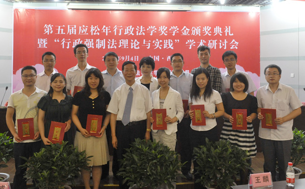 著名行政法学家、中国行政法学研究会会长、中国政法大学终身教授应松年、陕西省高级人民法院院长安东博士、西北政法大学校长贾宇教授、中国政法大学副校长马怀德教授、西安市城管执法局局长吕强以及来自全国各地高校的15位法学界专家学者、获奖学生、行政法学院部分教师和本科生参加了颁奖典礼。典礼由行政法学院院长王周户教授主持,贾宇校长致开幕词,陕西省高级人民法院院长安东、西安市城管执法局局长吕强等发言,对获奖同学表示祝贺,希望他们再接再厉,取得更好的成绩,为我国的法治建设贡献自己的力量。应松年教授亲自为获奖同学颁奖。