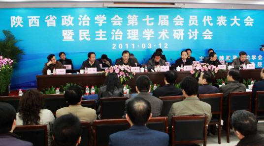 陕西省政治学会第七届会员代表大会暨民主治理学术研讨会于2011年3月12日在西安邮电学院长安校区的学术交流中心隆重召开。陕西省社会科学界联合会杨凡副主席,中国政治学会常务理事、陕西省政治学会第六届理事会会长董小龙教授,西安邮电学院院长卢建军教授,陕西省政治学会第六届理事会常务副会长王楷模教授,陕西省政治学会第六届理事会副会长王振亚教授、高锋同志、梁忠民教授、李刚教授、左晓民教授、朱正威教授,陕西省政治学会第六届理事会秘书长张师伟教授,学会各理事单位的代表及个人会员代表近60人出席代表大会。