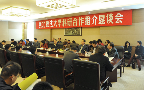 12月13日晚8:30,西北政法大学科研合作推介恳谈会在陕西宾馆12号楼3层第一会议室召开,来自西安经济技术开发区、西安市金融办等实务部门的代表与我校刑事法学院、民商法学院、行政法学院、国际法学院、公安学院、经济管理学院、政治管理学院等学院的院长及教师40多人齐聚一堂,共同商讨利用我校在法学等人文社会科学领域的资源优势为地方经济建设服务的大计。恳谈会由西北政法大学校长助理、科研处处长汪世荣教授主持,郭捷副校长、王瀚副校长出席会议,并做了发言。