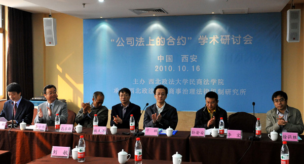 2010年10月16日,“公司法上的合约”学术研讨会在西北政法大学举行,中国人民大学法学院博士生导师、中国法学会商法学研究会副会长叶林教授,清华大学法学院副院长、博士生导师、中国法学会证券法学会研究会副会长施天涛教授,最高人民法院民二庭高级法官刘敏,陕西省高级人民法院民二庭孙渝安庭长、魏西霞副庭长,咸阳市中级人民法院李宏副院长,河南财经政法大学法学院副院长徐强胜教授,西北政法大学民商法学院学术委员会主任委员、西北政法大学商事治理法律机制研究所所长高在敏教授,民商法学院院长李少伟教授和副院长张翔教授等六十余人参加会议。会议由西北政法大学民商法学院主办,西北政法大学商事治理法律机制研究所承办。