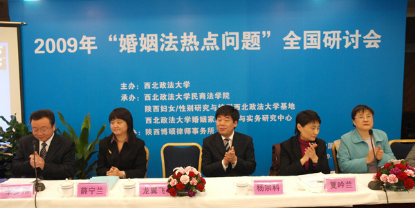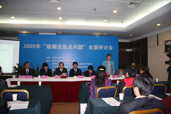 2009年11月21日上午9:30分,2009年“婚姻法热点问题”全国研讨会在西安东方大酒店开幕。本次会议作为西北政法大学恢复招生30周年学术系列活动之一,重点围绕结婚制度与夫妻关系、离婚的后果及相关问题等议题展开探讨。会议由西北政法大学主办,西北政法大学民商法学院、陕西妇女/性别研究与培训西北政法大学基地、西北政法大学婚姻家庭法律与实务研究中心共同承办,陕西博硕律师事务所协办。夏吟兰、龙翼飞、马忆南、薛宁兰等知名学者和来自中国法学会婚姻法学研究会、陕西省妇联、陕西省法学会、陕西省妇女研究会、各有关高等学校、部分司法机关和律师事务所以及香港大公报、陕西日报、西安日报、西安晚报、华商报、三秦都市报等媒体的90多位代表参加了会议。