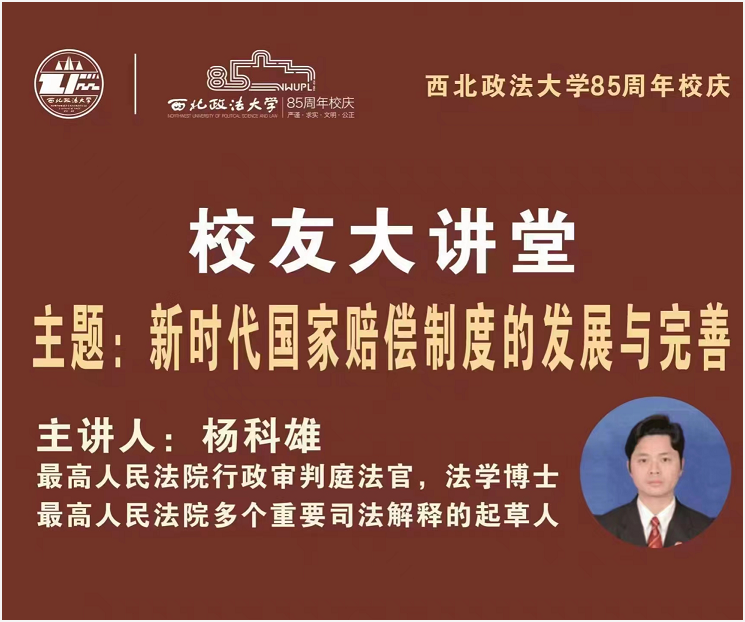 10月28日晚,由行政法学院(纪检监察学院)主办的西北政法大学85周年校庆系列学术讲座在线上顺利举行。学院邀请最高人民法院行政审判庭法官、法学博士,校友杨科雄法官为师生做题为《新时代国家赔偿制度的发展与完善》的讲座。西北政法大学行政法学院(纪检监察学院)院长姬亚平教授主持讲座,校内外师生、学术界专家、律师等近三百人在线上参加讲座。