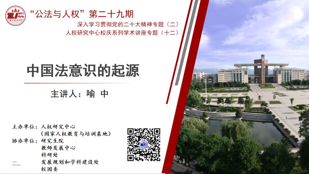 11月10日晚7:30,由人权研究中心主办,研究生院、教师发展中心、科研处、发展规划和学科建设处、校团委协办的“公法与人权”第29期、深入学习贯彻党的二十大精神专题(二)、人权研究中心校庆系列学术讲座专题(十二)在线上顺利举行。中国政法大学喻中教授做题为《中国法意识的起源》讲座,钱锦宇教授主持,魏治勋教授、马成教授、魏磊杰副教授、赵小静博士与谈,杨建军教授总结,校内外师生300余人在线上参加讲座。