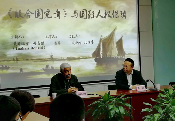 4月29日上午,联合国人权咨询委员会专家、阿尔及利亚大学教授莱兹赫里·布齐德(Lazhari Bouzid)应邀访问我校人权研究院,并举行题为《联合国宪章与国际人权保障》的学术讲座。讲座由副校长漆思教授主持,中华人民共和国驻塞浦路斯共和国(原)大使刘昕生和人权研究院执行院长钱锦宇作为与谈人参加活动。国际法学院、人权研究院负责同志以及我校部分青年教师、本科生和研究生共40余人聆听了本次讲座。