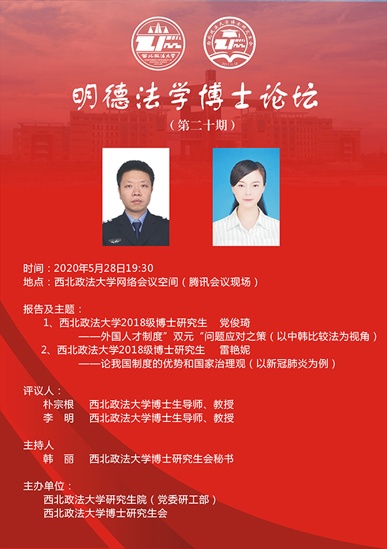 5月28日晚7点30分,我校第二十期“明德法学博士论坛”以视频会议形式在线举办。本次论坛邀请朴宗根教授、李明教授担任评议人,并由博士研究生会主席团秘书、2019级博士研究生韩丽担任主持人,20余名博士研究生参加了本次论坛。