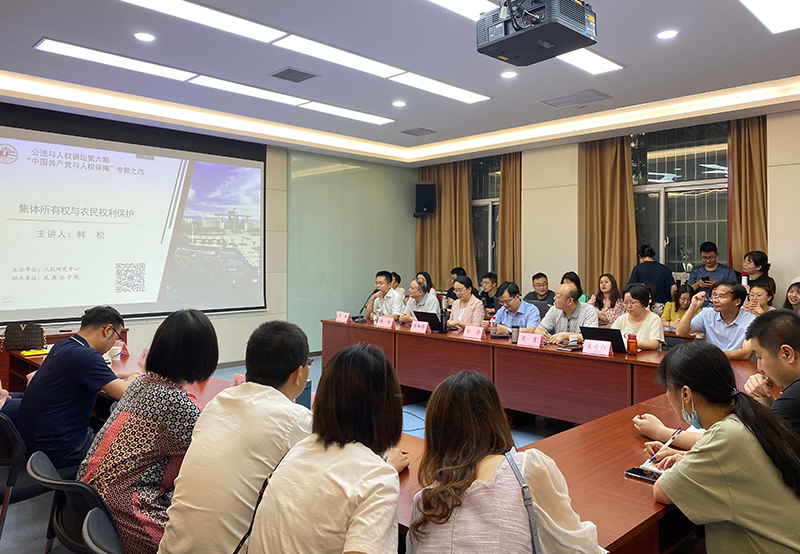 6月9日晚,由人权研究中心主办,民商法学院协办的“公法与人权”讲坛第六期、“中国共产党与人权保障”专题之四在雁塔校区举办。长江学者、校学术委员会主任、民商法学院韩松教授主讲《集体所有权与农民权利保护》。人权研究中心执行主任常安教授主持,民商法学院副院长、导师组组长程淑娟教授致辞,彭涛教授、袁震教授、安子明副教授、陈凌云副教授、王东副教授、孙政伟博士、李蔚博士与谈。我校部分教师、博士、硕士研究生等60余人参与本次会议。