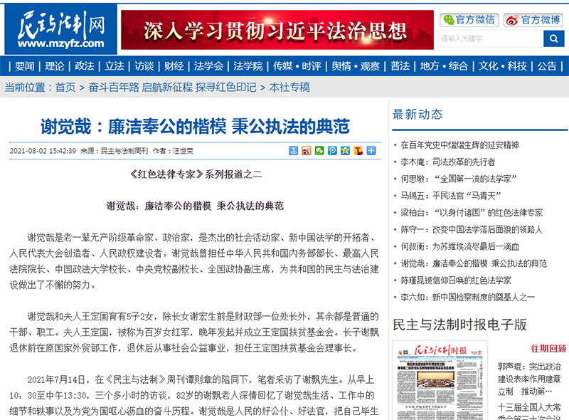 2021年7月14日,在《民主与法制》周刊谭则章的陪同下,笔者采访了谢飘先生。从早上10:30至中午13:30,三个多小时的访谈,82岁的谢飘老人深情回忆了谢觉哉生活、工作中的细节和轶事以及为党为国呕心沥血的奋斗历程。谢觉哉是人民的好公仆、好法官,把自己毕生的精力献给了中国人民的伟大革命和建设事业。谢觉哉民主法治思想对人民政权建设、人民司法建设,产生过重要的指导意义,至今仍然具有现实的借鉴价值。