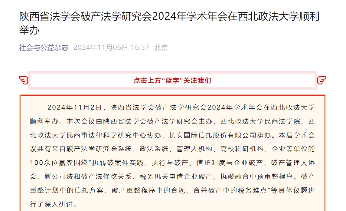 【社会与公益杂志】陕西省法学会破产法学研究会2024年学术年会在西北政法大学顺利举办https://mp.weixin.qq.com/s/2mhbQEZlqGDNO-9W-upkDQ