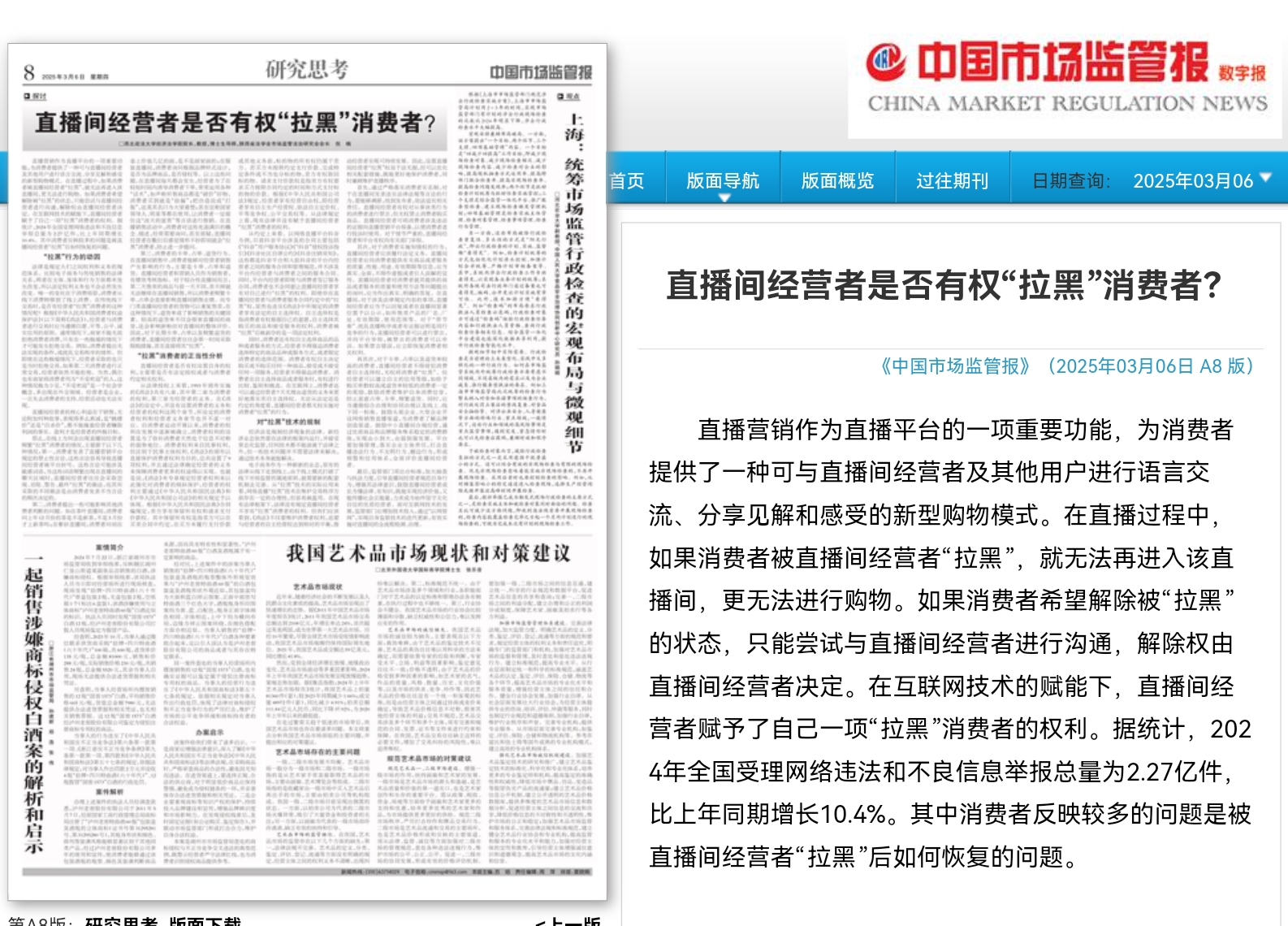 【中国市场监管报】倪楠:直播间经营权是否有权“拉黑”消费者http://pc.cmrnn.com.cn/shtml/zggsb/20250306/122128.html