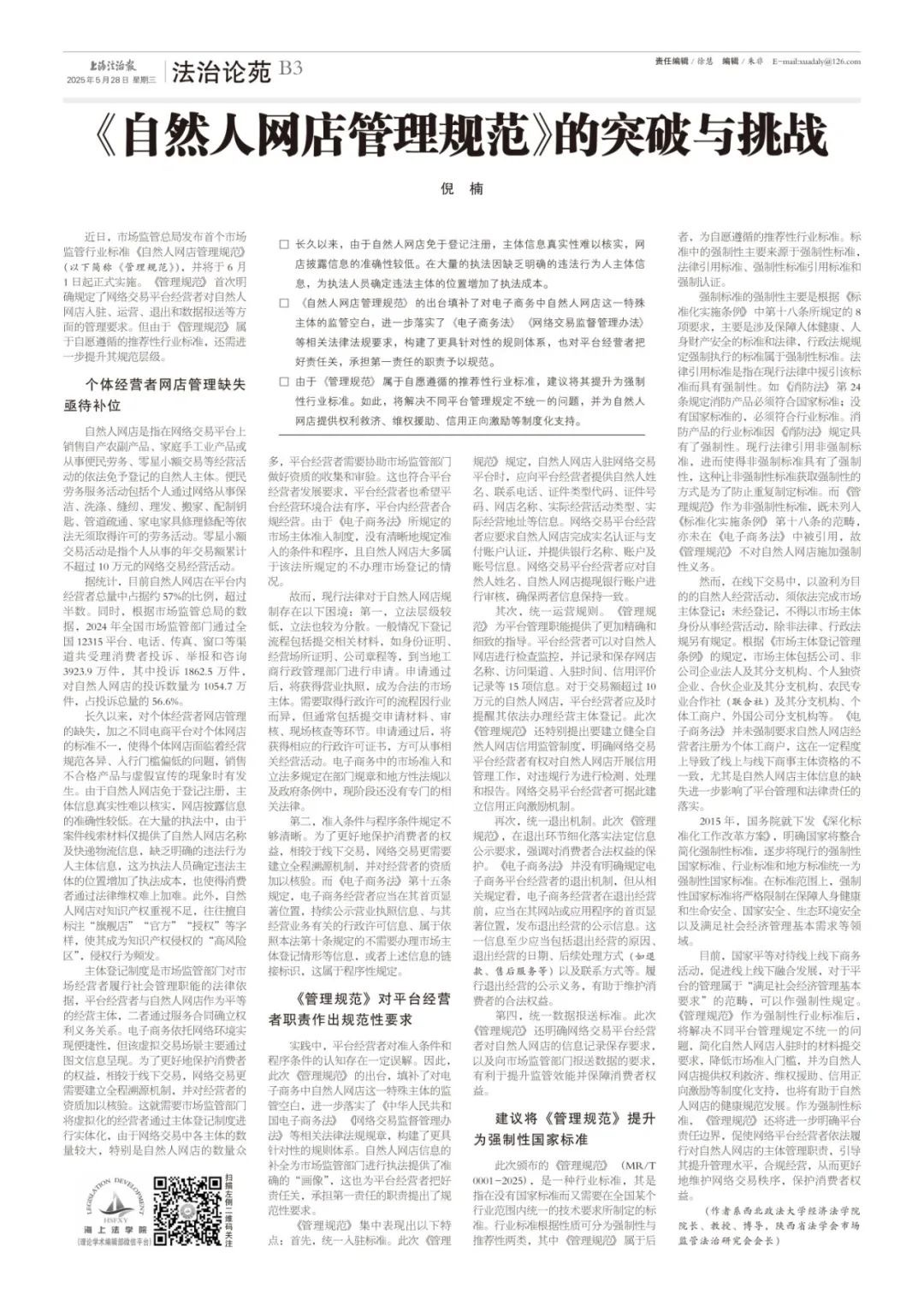 【上海法治报】倪楠:《自然人网店管理规范》的突破与局限:https://mp.weixin.qq.com/s/yifsrbWcreuyBnv8EzprFA