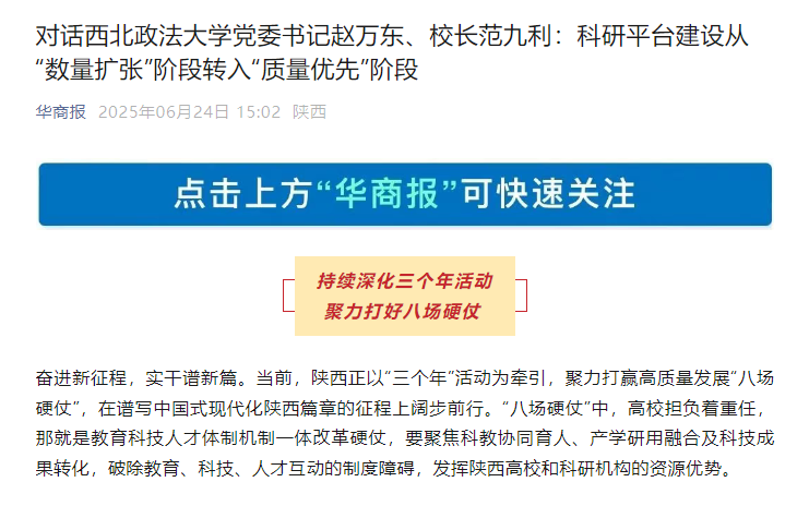 【华商报】对话西北政法大学 党委书记赵万东、校长范九利 科研平台建设从『数量扩张』阶段转入『质量优先』阶段 http://ehsb.hspress.net/shtml/hsb/20250624/725065.shtml