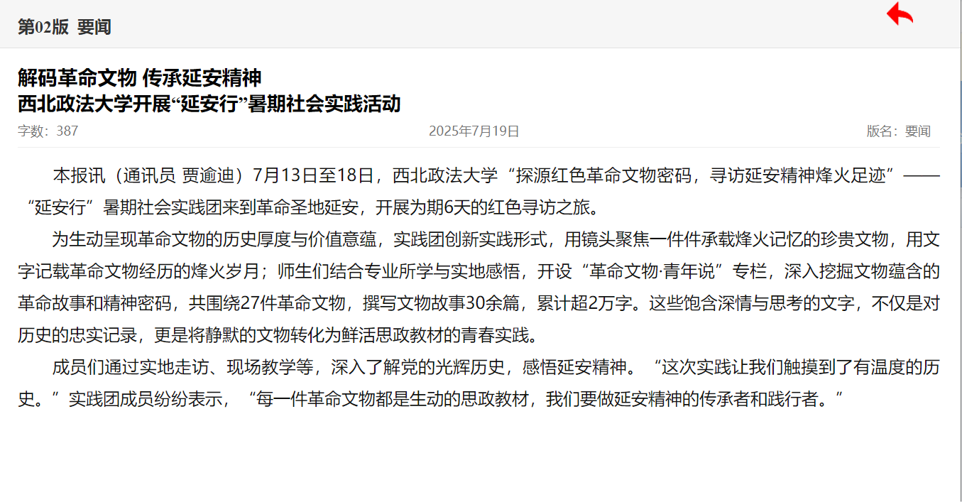 【延安日报】解码革命文物 传承延安精神 西北政法大学开展“延安行”暑期社会实践活动https://paper.yanews.cn/yarb/20250719/mhtml/page_01_content_20250719002008.htm#page01