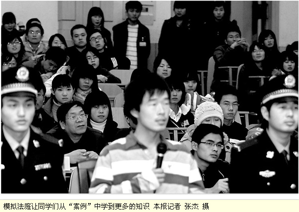 昨晚在西北政法大学南校区模拟法庭进行的一场模拟庭审中,有四五百名学生旁听,“公诉人”和“被告人”、“辩护人”在法理、情理间展开激烈辩论。虽然只是大学校园内一场模拟庭审,但从“书记员”宣读开庭规则到“法警”带“被告人”入庭,以及“公诉人”宣读起诉书到“证人”作证……每个程序,学生们都很投入地扮演各自的角色。