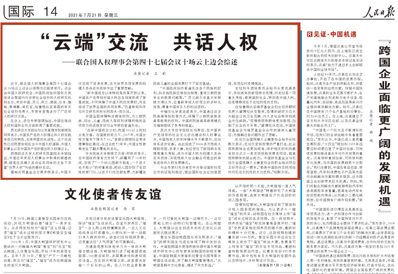 近日,联合国人权理事会第四十七届会议10场云上边会以视频方式陆续举行。边会由中国人权研究会、中国民间组织国际交流促进会等国内外多家社会组织和人权研究机构主办,来自中国、芬兰、荷兰、挪威、日本、缅甸、柬埔寨、肯尼亚、埃塞俄比亚等国的有关社会组织负责人、专家学者等进行了广泛深入的研讨交流。