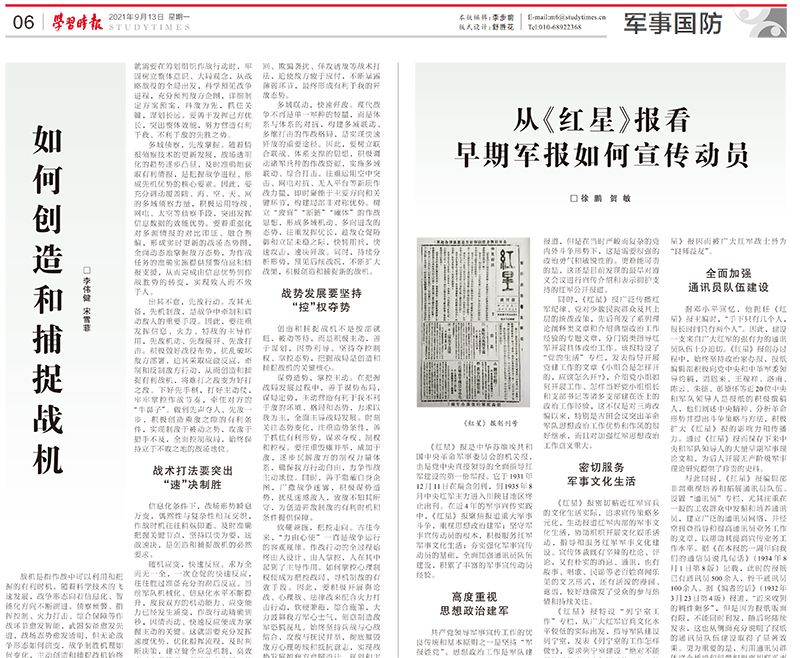 中央党校《学习时报》发表我校徐鹏老师和研究生贺敏共同撰写的文章:从《红星》报看早期军报如何宣传动员