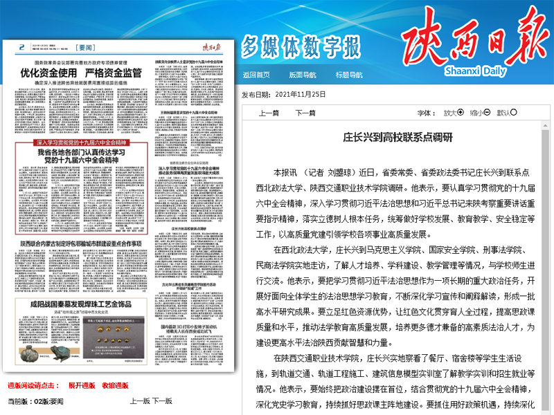 本报讯 (记者 刘曌琼)近日,省委常委、省委政法委书记庄长兴到联系点西北政法大学、陕西交通职业技术学院调研。他表示,要认真学习贯彻党的十九届六中全会精神,深入学习贯彻习近平法治思想和习近平总书记来陕考察重要讲话重要指示精神,落实立德树人根本任务,统筹做好学校发展、教育教学、安全稳定等工作,以高质量党建引领学校各项事业高质量发展。