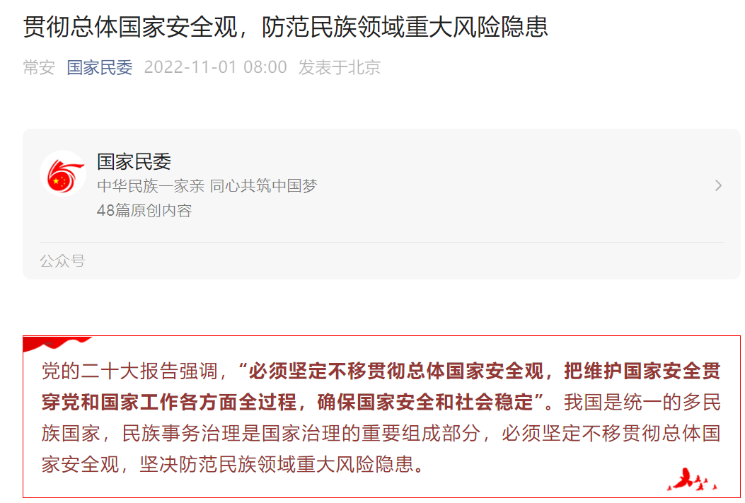 党的二十大报告强调,“必须坚定不移贯彻总体国家安全观,把维护国家安全贯穿党和国家工作各方面全过程,确保国家安全和社会稳定”。我国是统一的多民族国家,民族事务治理是国家治理的重要组成部分,必须坚定不移贯彻总体国家安全观,坚决防范民族领域重大风险隐患。