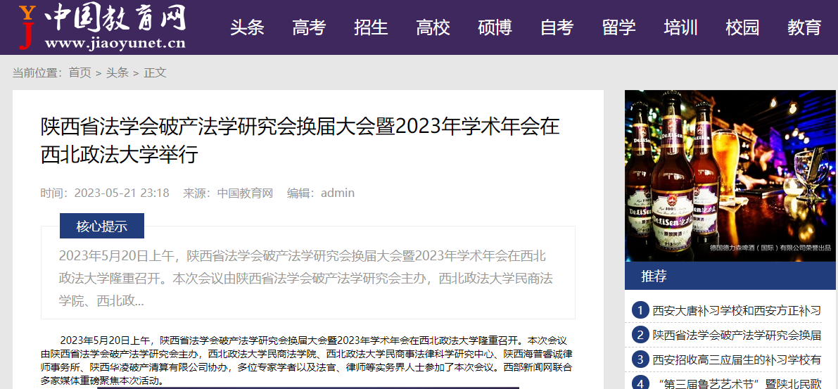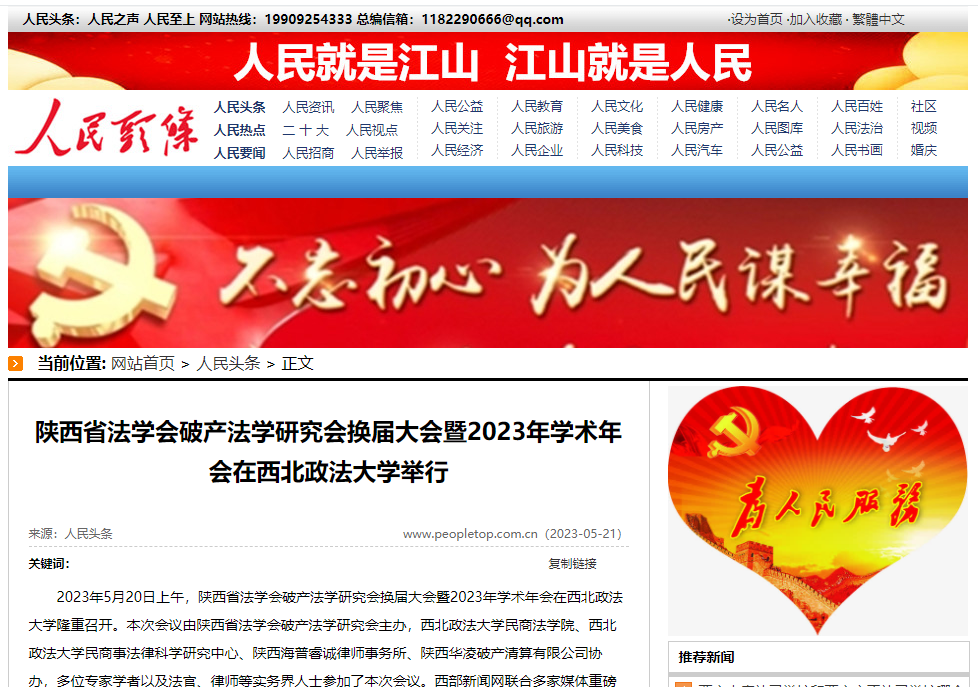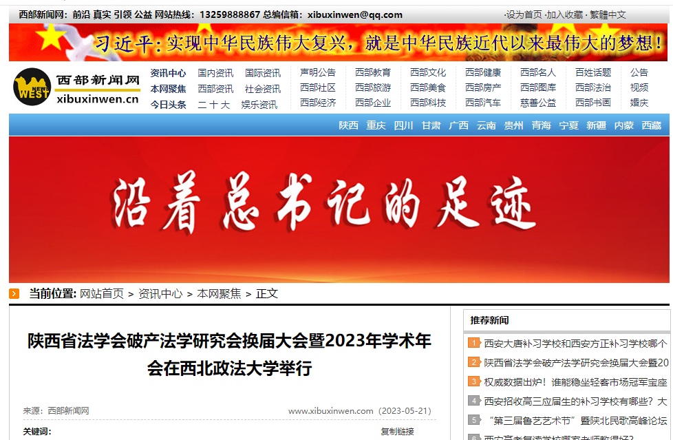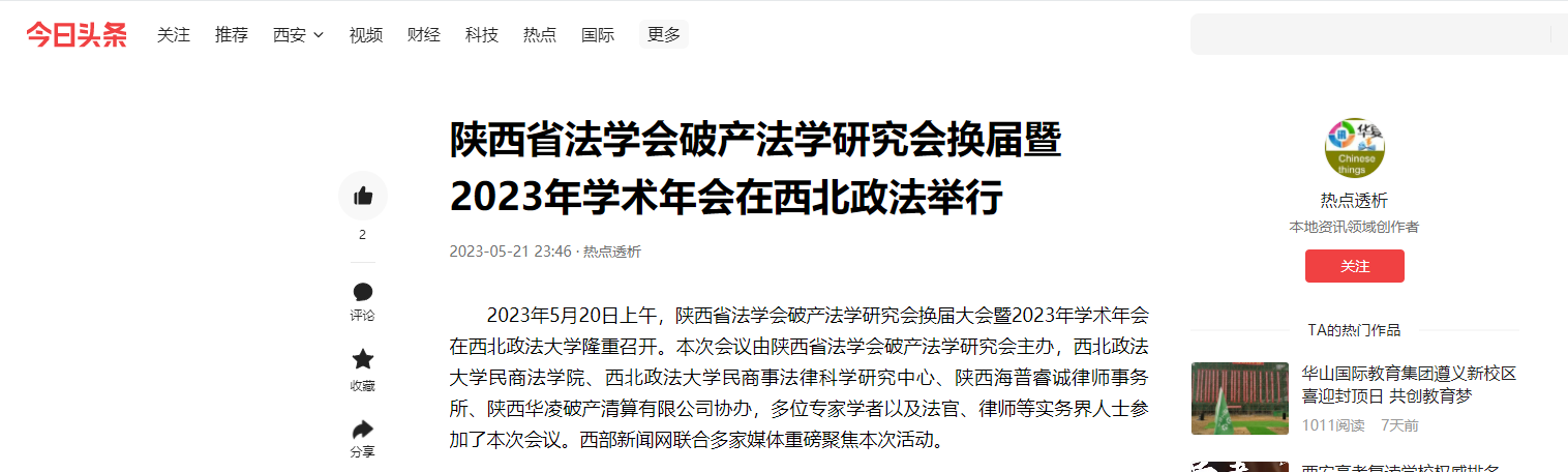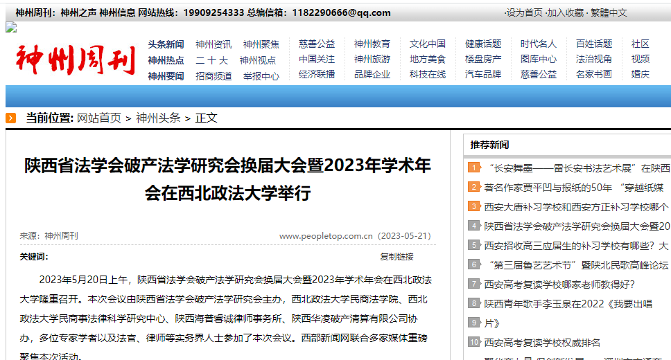 2023年5月20日上午,陕西省法学会破产法学研究会换届大会暨2023年学术年会在西北政法大学隆重召开。本次会议由陕西省法学会破产法学研究会主办,西北政法大学民商法学院、西北政法大学民商事法律科学研究中心、陕西海普睿诚律师事务所、陕西华凌破产清算有限公司协办,多位专家学者以及法官、律师等实务界人士参加了本次会议。西部新闻网联合多家媒体重磅聚焦本次活动。
