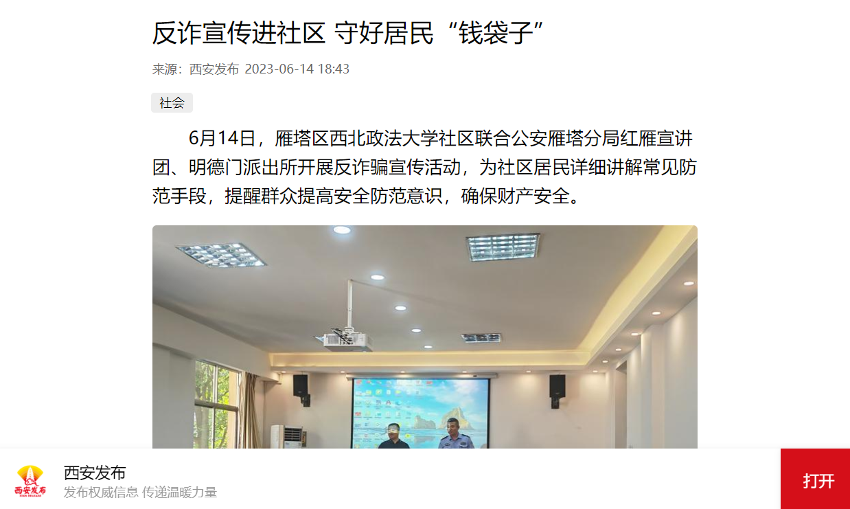 6月14日,雁塔区西北政法大学社区联合公安雁塔分局红雁宣讲团、明德门派出所开展反诈骗宣传活动,为社区居民详细讲解常见防范手段,提醒群众提高安全防范意识,确保财产安全。