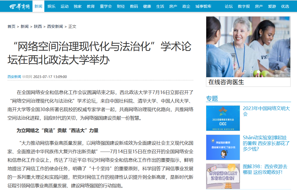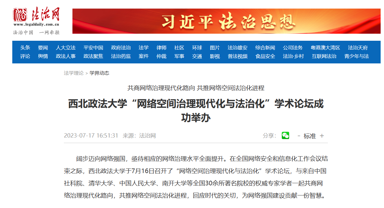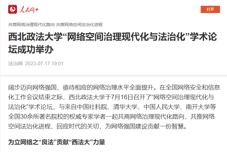 建设网络强国,营造风清气正的网络空间,离不开法治手段的保障。作为一所法学特色鲜明的高水平大学,西北政法大学不负时代使命、直面时代议题,召开此次“网络空间治理现代化与法治化”学术论坛,为中国互联网“良法善治”的建设贡献一份“西法大”力量。
