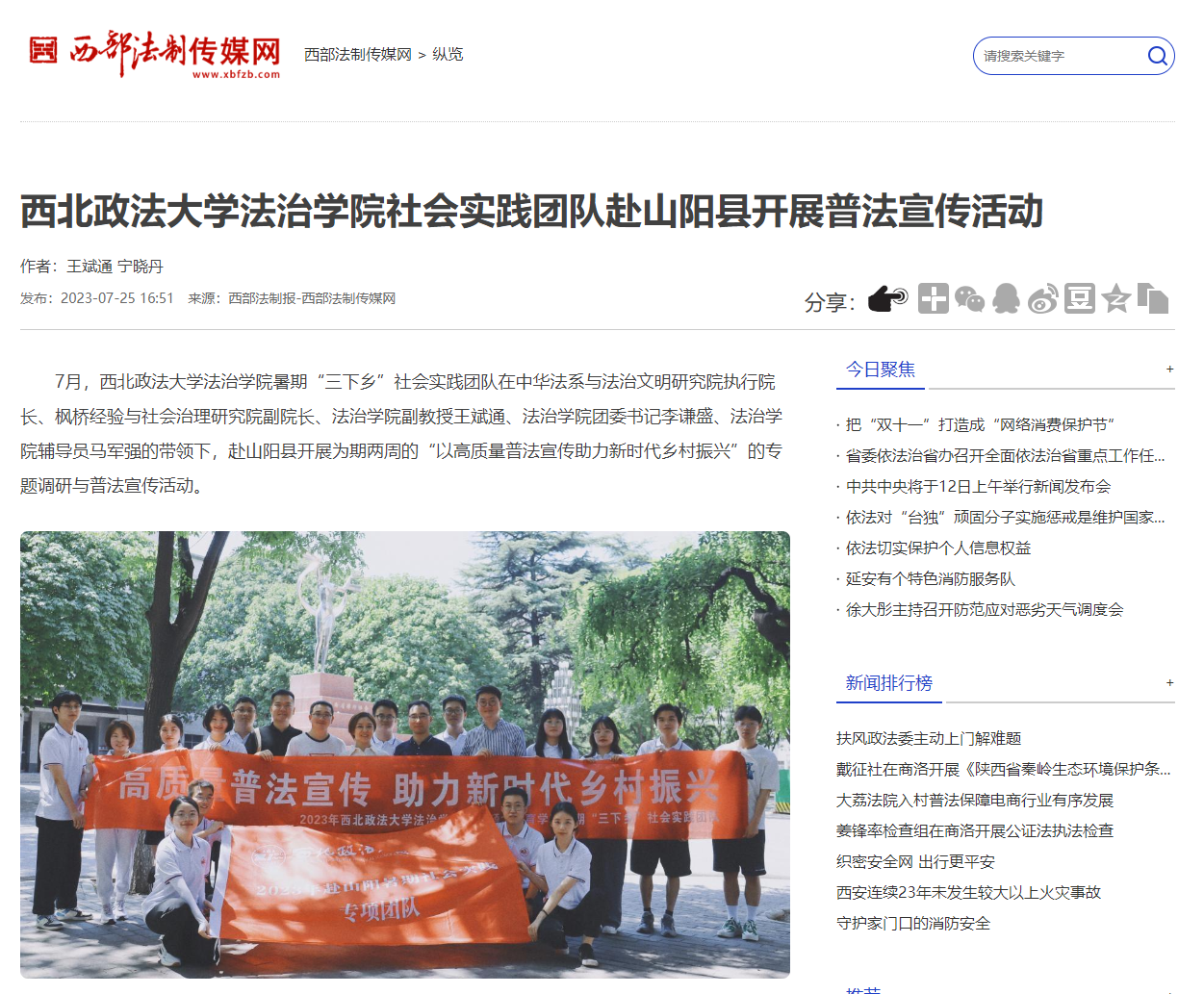 7月,西北政法大学法治学院暑期“三下乡”社会实践团队在中华法系与法治文明研究院执行院长、枫桥经验与社会治理研究院副院长、法治学院副教授王斌通、法治学院团委书记李谦盛、法治学院辅导员马军强的带领下,赴山阳县开展为期两周的“以高质量普法宣传助力新时代乡村振兴”的专题调研与普法宣传活动。
