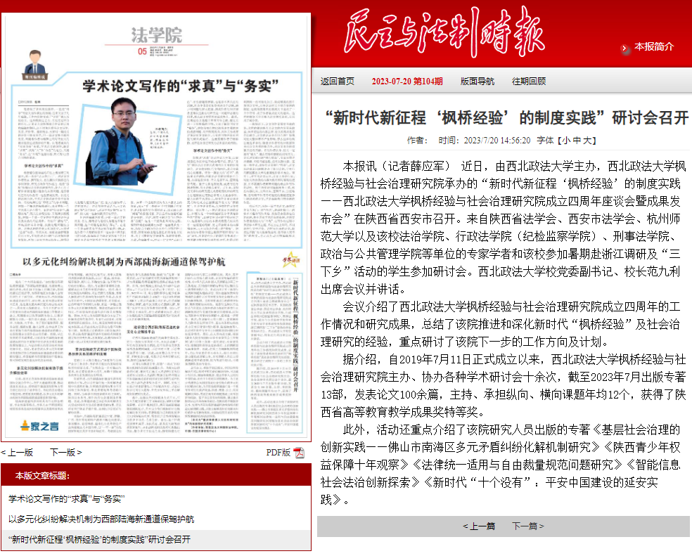 据介绍,自2019年7月11日正式成立以来,西北政法大学枫桥经验与社会治理研究院主办、协办各种学术研讨会十余次,截至2023年7月出版专著13部,发表论文100余篇,主持、承担纵向、横向课题年均12个,获得了陕西省高等教育教学成果奖特等奖。