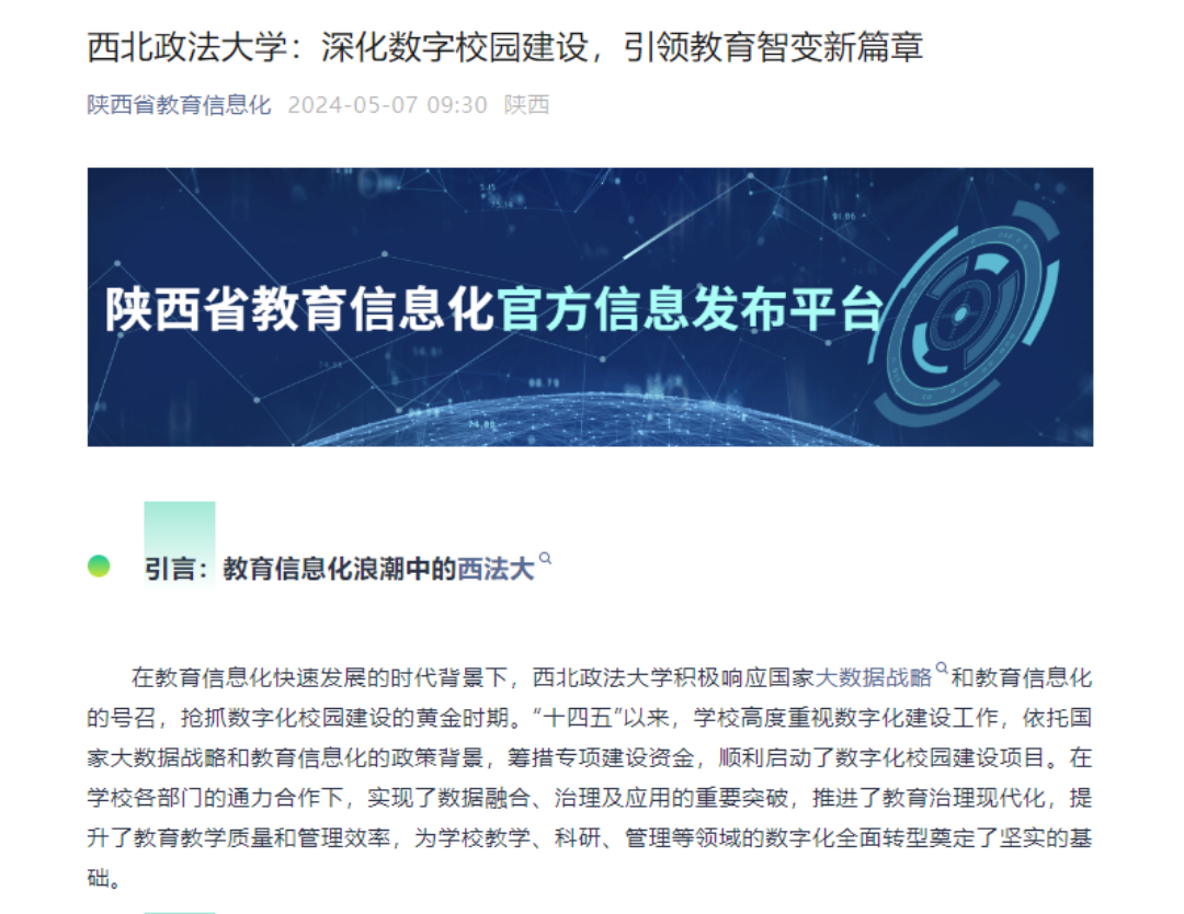 西北政法大学的数字化校园建设,是在国家数字化建设战略和教育信息化政策指导下,依托先进技术和校企合作实现的重要成果。通过数据在融合、治理和场景应用方面的深入建设,学校不仅提升了数据管理和使用的效率,也为构建智慧校园和推进教育现代化提供了坚实基础。随着数字化校园建设的不断深入,西北政法大学将在教育信息化道路上迈出更坚实的步伐,为构建更加开放、共享、安全、智能的数字化校园做出更大努力,为助力新质生产力加快形成贡献重要力量。