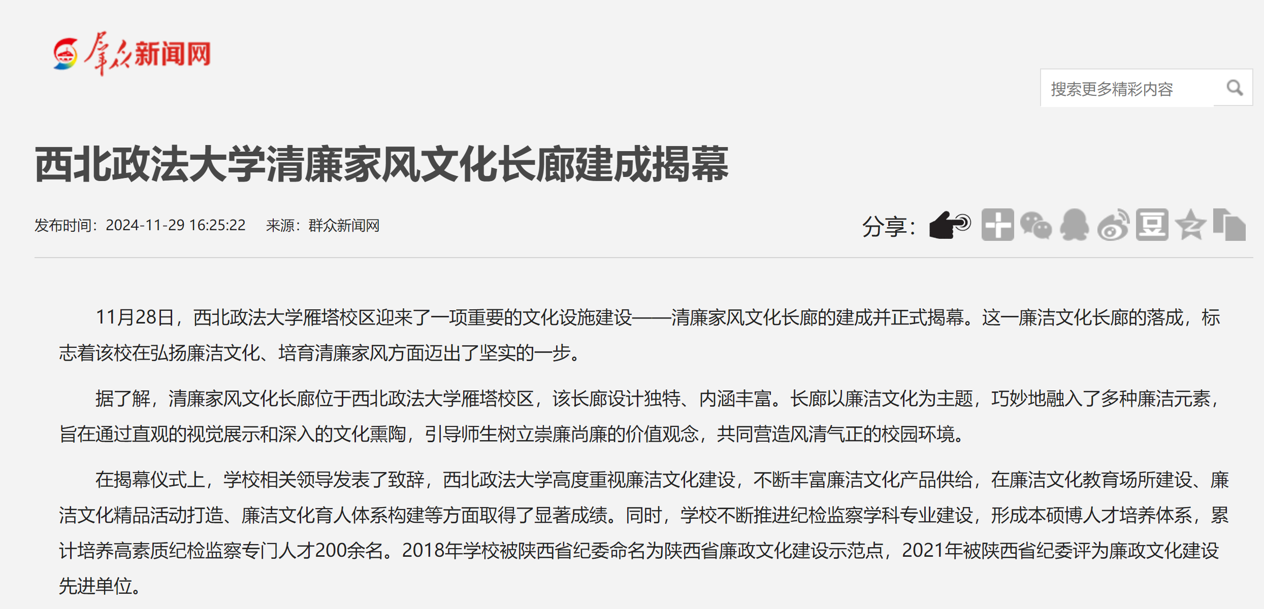 【群众新闻网】西北政法大学清廉家风文化长廊建成揭幕https://www.sxdaily.com.cn/2024-11/29/content_10963154.html