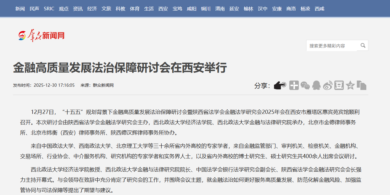 【群众新闻】金融高质量发展法治保障研讨会在西安举行 https://www.sxdaily.com.cn/2025-12/30/content_11469245.html#10006-weixin-1-52626-6b3bffd01fdde4900130bc5a2751b6d1
