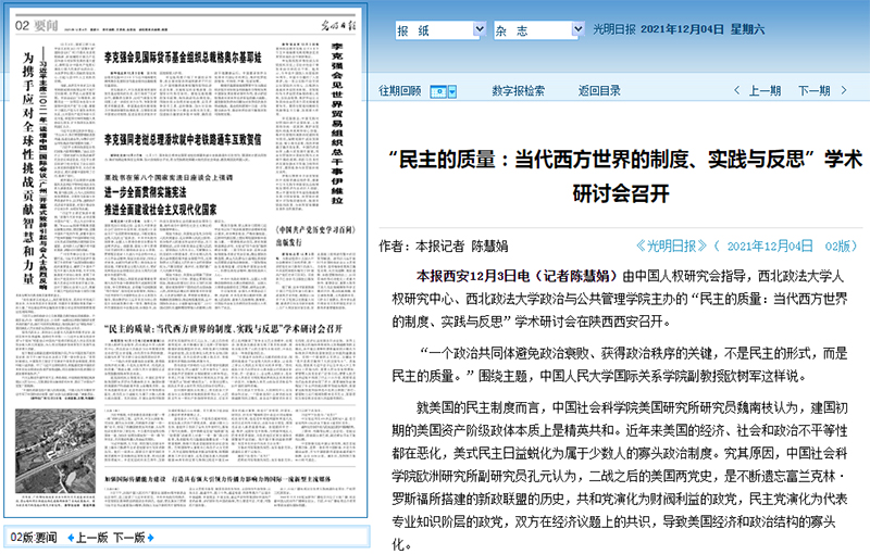 本报北京12月3日电 (记者杨昊)12月3日,由中国人权研究会指导,西北政法大学人权研究中心、西北政法大学政治与公共管理学院主办的“民主的质量:当代西方世界的制度、实践与反思”学术研讨会在西安召开。来自国内多所高校和研究机构的专家学者以线上线下相结合的方式参加了研讨会。