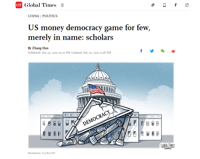 Commenting on the poll, Chinese Foreign Ministry spokesperson Zhao Lijian said on Friday's routine press conference that US democracy is money democracy, a trick to fool the people domestically and a tool to impose hegemony abroad.